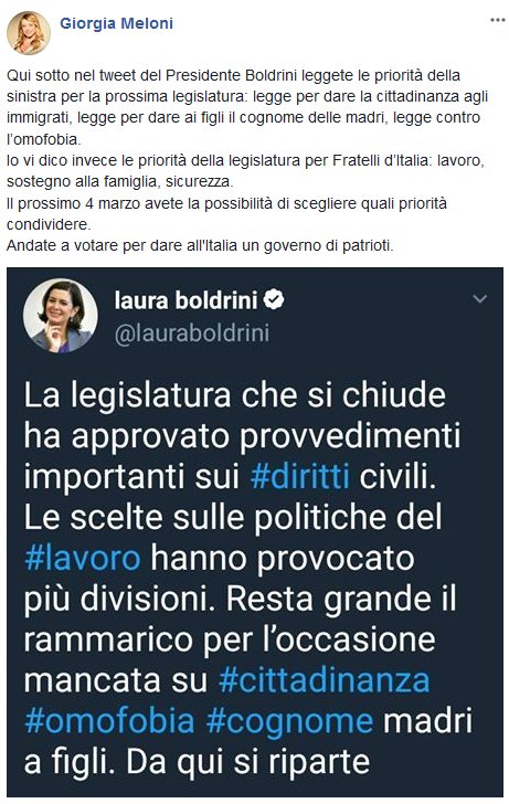 Giorgia Meloni ن On Twitter In Un Tweet Il Presidente Boldrini Elenca Le Priorita Della Sinistra Ius Soli E L Omofobia Per Fdi Le Priorita Invece Sono Lavoro Sostegno Alla Famiglia Sicurezza