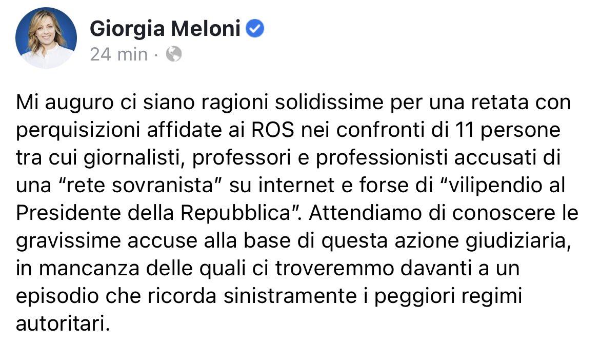 Giorgia Meloni ن On Twitter Mi Auguro Ci Siano Ragioni Solidissime Per La Retata Nei Confronti Di 11 Persone Accusate Di Una Rete Sovranista Su Internet E Forse Di Vilipendio Al