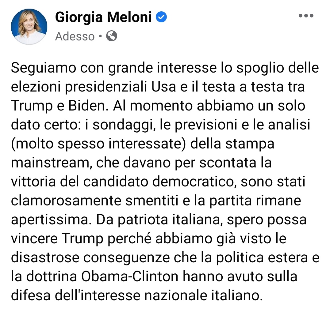 Giorgia Meloni ن On Twitter Da Patriota Italiana Spero Possa Vincere Trump Perche Abbiamo Gia Visto Le Disastrose Conseguenze Che La Politica Estera E La Dottrina Obama Clinton Hanno Avuto Sulla Difesa
